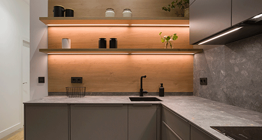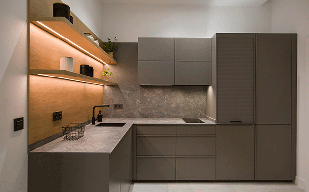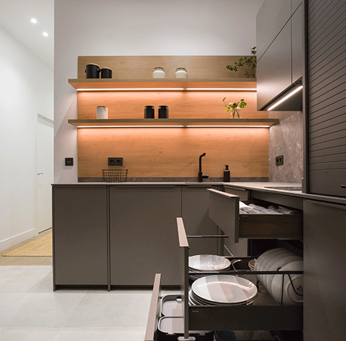 En el interior, los accesorios en acabado nogal introducen una nota cálida y natural, que complementa la sobriedad de los tonos grises. La iluminación LED integrada en colgantes y baldas refuerza la sensación de amplitud, realzando la textura de los materiales y creando un entorno funcional y agradable.